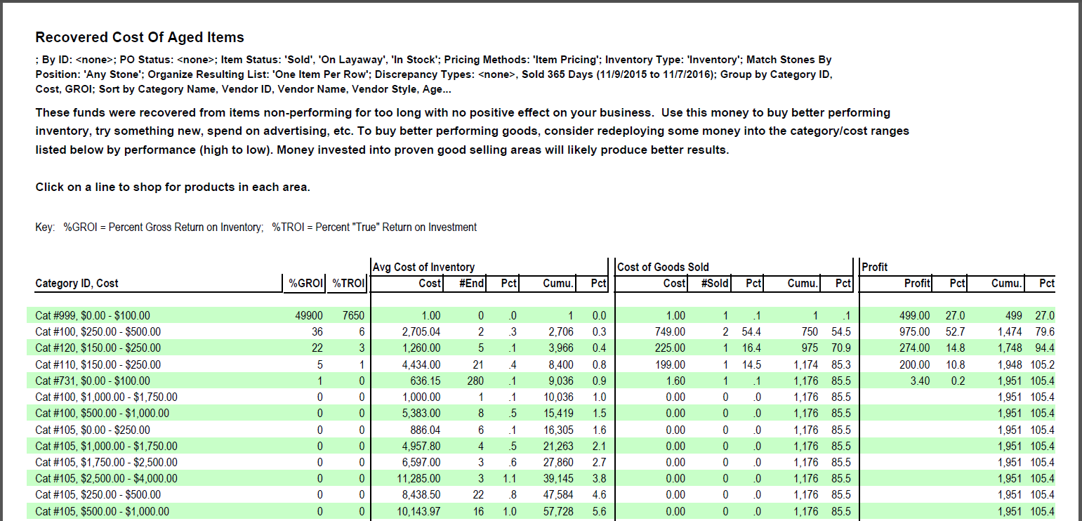 The Recovered Cost of Aged Items report helps you plan the reinvestment of dollars recovered from the sales of aged items. When you put aged items on spiff or sale, you’ll move inventory that has been sitting around for a long time. This is almost like found money that you can now think about investing in good performing categories. It shows a more detailed view of recovered funds than that shown in the Recovered Funds Redeployment Guide.