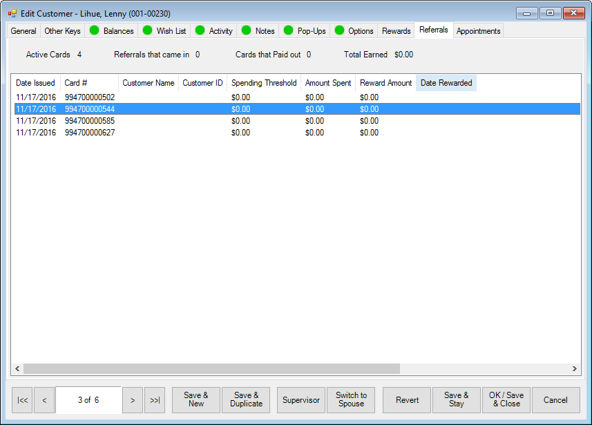 The Referrals tab will only appear if you have referrals enabled and when the customer has referral cards to hand out. Fields and options in the Referrals tab include: