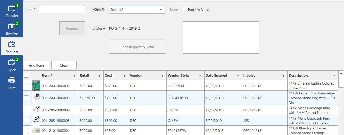 The transfer # for this shipment (system generated). After initiating a request, all subsequent items will be assigned this same # until you click Close Request & Send. Format: TR (Transfer) or RQ (Request) _ Store # _ Date _ Sequential digit. E.g. RQ_ST1_4_4_2019_1 is a request initiated from store 01 on 4/4/2019 and 1 indicates it is the first transfer that day. |
