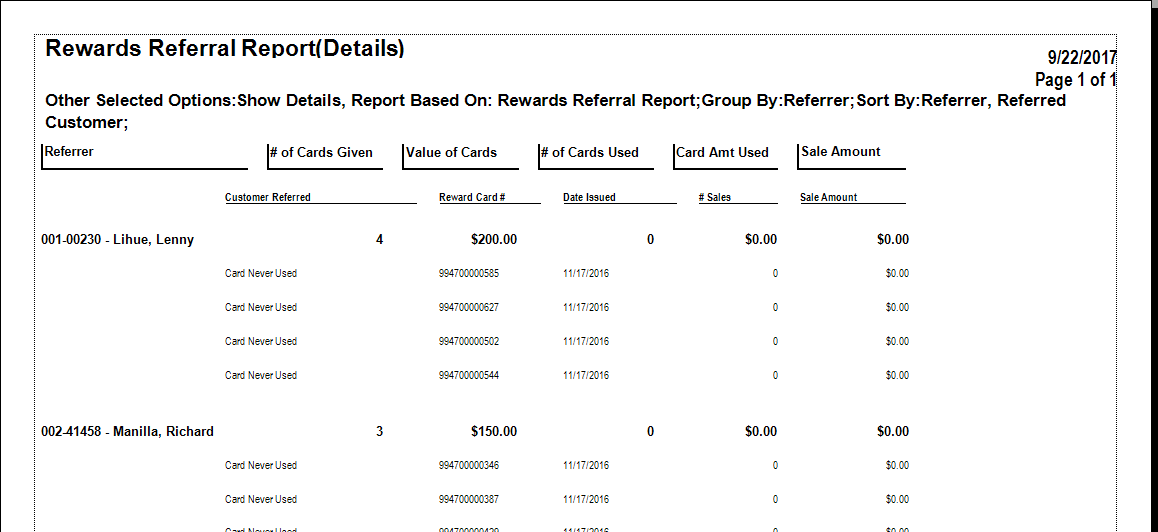 The Rewards Referral report shows the referral cards issued to customers for distribution, what customers have them and activity on them.
