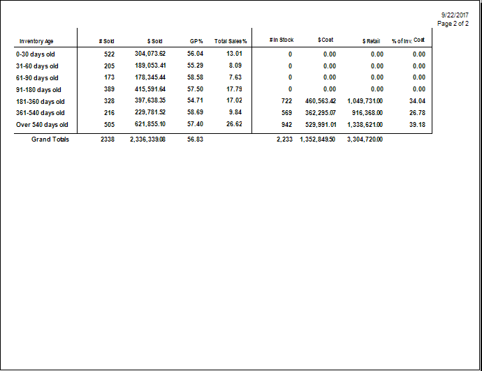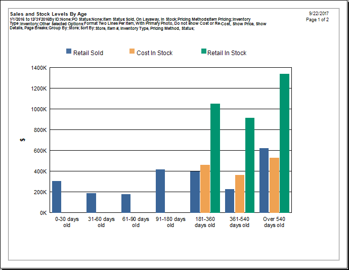 The Sales by Age report shows amounts of inventory sold and in-stock by length of time in inventory.