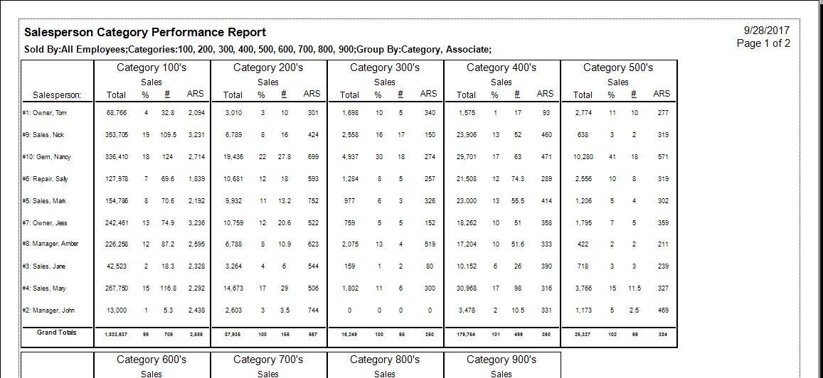 The Salesperson Category Performance report shows data similar to that shown in the Salesperson Performance report, but by category. It summarizes sales results and divides the same sales into major categories (i.e., Cat 100, Cat 200, etc.), to determine where sales persons’ skills are. This report will reveal in what category sales people are making sales and perhaps illustrate difficulty with watches or high-priced diamond merchandise. Layaways may or may not be included as with the report and special orders in progress are not included.