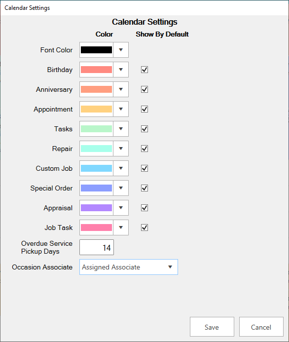 4. Use the Show By Default checkbox to determine which occasions and services appear on the calendar by default. These can always be changed on the fly from the main calendar view, too.