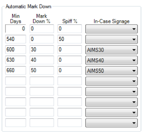 At the heart of automatic buying tools is the Automatic Mark Down table found on the Pricing tab of each category. The Mark Down table is used to define mark down amounts based on aging and should be setup for each participating category. Repricing goes through and applies the mark downs to selected items.