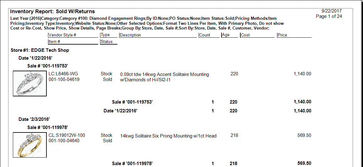 The Showing Returns report shows everything that was sold regardless of whether it was returned at a later date. For example, an item that was sold in the month of May, but returned in the month of June, would still show as sold if this report was run for May alone. Conversely, a standard Sold Items report for the month of May would not include an item that has since been returned.