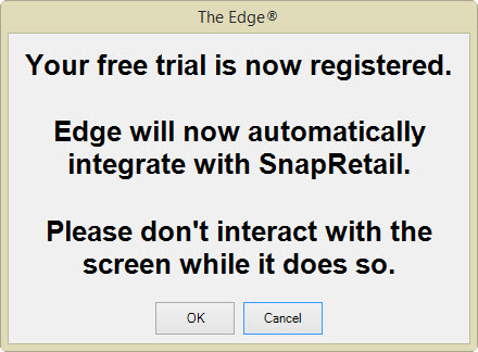 5. Select OK. The Edge will then automatically create your SnapRetail trial account and integrate it with your Edge license by automating a web browser window. Please do not interact with the web browser window; it will disappear once integration is complete. If an error occurs, the web browser window will remain visible so that you can take appropriate action.
