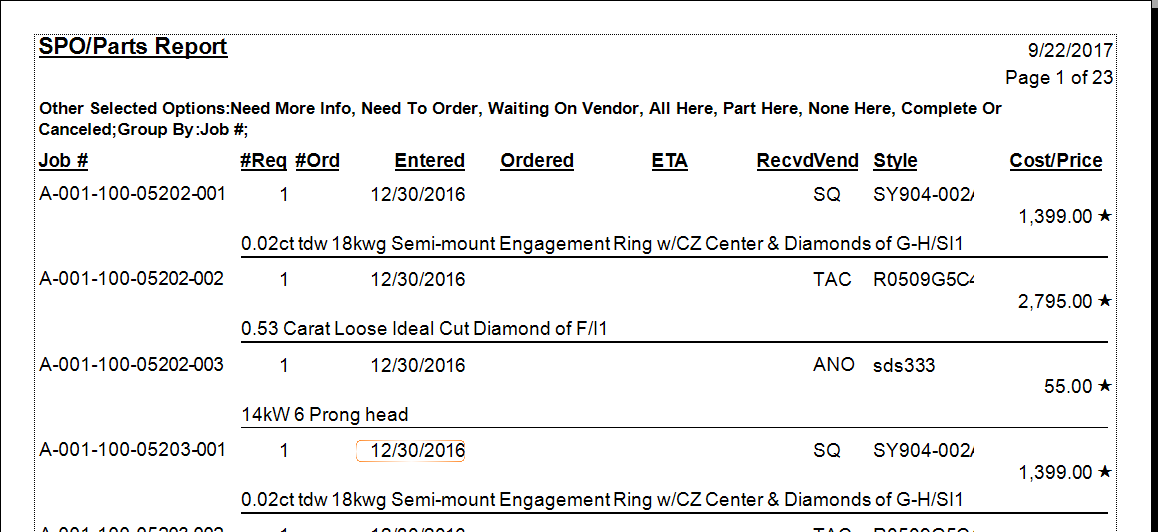 A star in the ETA field of the Special Order report indicates that the date and/or price is promised, not an estimate. |