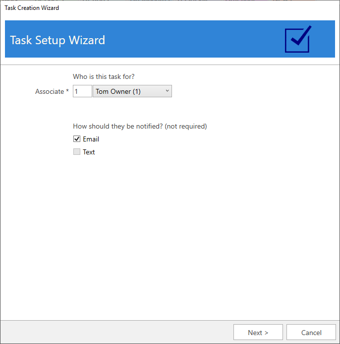 Click Associate > Tasks > Task Wizard. The Task Creation