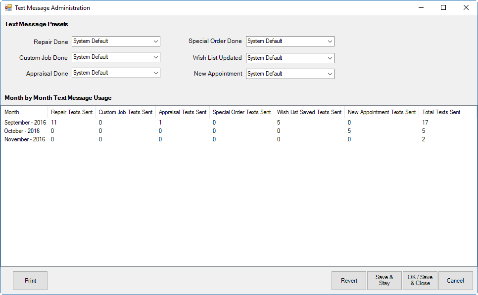 2. For each of Repair Done, Custom Job Done, Appraisal Done, Special Order Done, and New Appointment, select whether to use the system default message, or a pre-defined message.