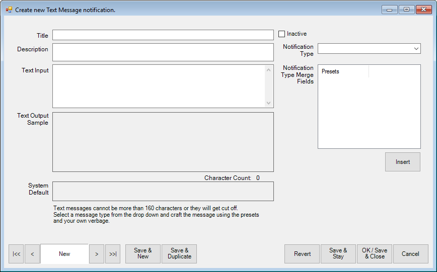 1. Select Administrative ► Notifications ► Text Messages. The Create New Text Message Notification window will appear.