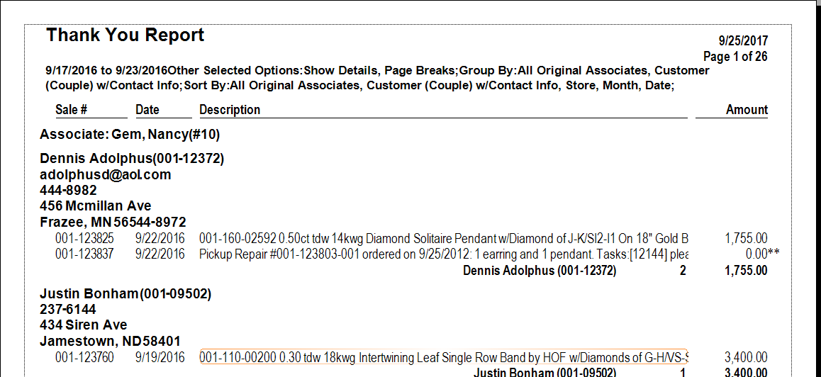 The Thank You report details a combination of information useful for following up with customers. It shows contact information and a sales history for customers. This might be useful in helping you to thank a customer for his business. The query for it is similar to that of activity reports. For more about report filters and settings, see the section entitled Creating a Report.