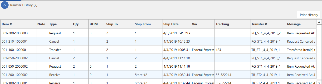 Transfer history keeps a running log of all transfer activity during this session. Closing the Transfer Screen will end the session and clear the log.