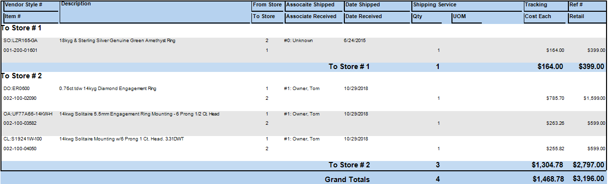 The Transfer Report provides a detailed history of store-to-store transfers. Note that if the same item is transferred a number of times, the amounts shown may be inaccurate. For more about report filters and settings, see the section entitled Creating a Report and the high-level section entitled Inventory Reports.