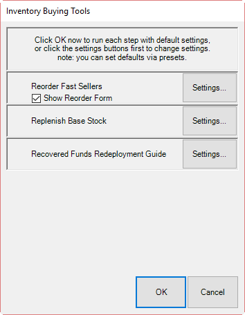 a. Reorder Fast Sellers, which yields the Rapid Reorder Report and Form. This step is used to setup the rapid reorder report and form. From the Settings options, the sale date range should always be Last Week (it will default to this; this step is designed to be run weekly). See the section entitled Rapid Reorder for more information on setting fast seller and reorder criteria.