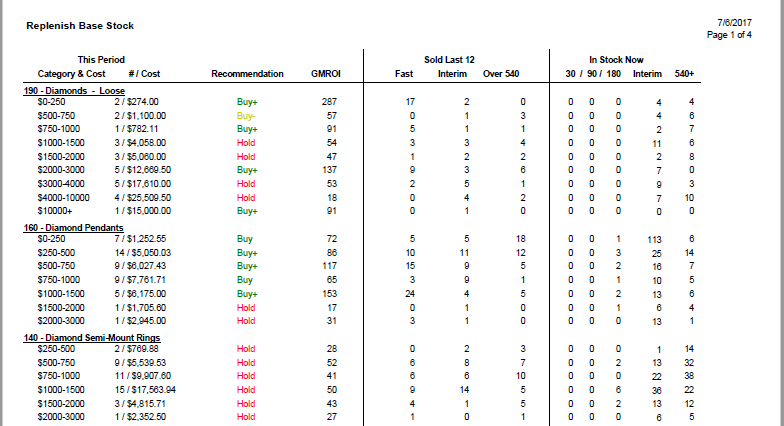 In the example above, in category 190, Loose Diamonds in the cost range of $0-$250, the recommendation is buy more because of 19 sold, 17 were fast sellers. We would recommend that you invest more in that area. In category 140, Diamond Semi-Mount Rings in the cost range of $250-$500, of 5 pieces sold, 0 were fast sellers and 2 were interim sellers. We would recommend you hold with the current inventory for the time being.