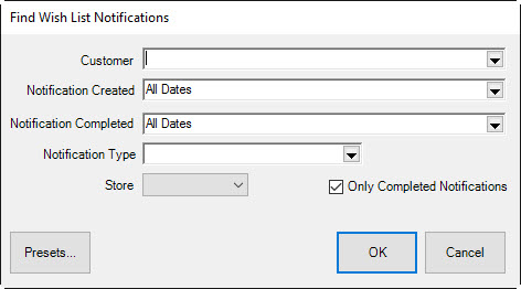 1. Select Customer ► Wish Lists ► Notifications ► Find. The Find Wish List Notifications filter will appear.