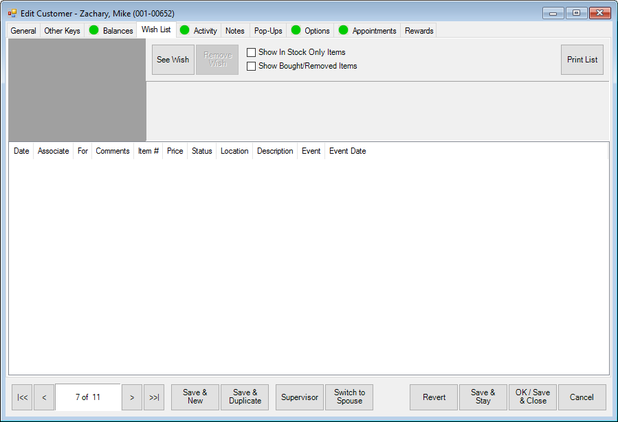 The Wish List tab fields contain values entered at point of sale. Fields and options in the Wish List tab include: